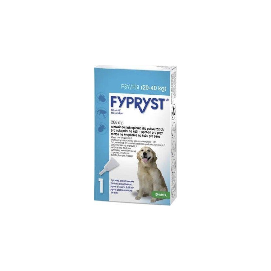 Fypryst preparatas šunims blusoms ir erkėms 20-40kg yra šunims skirtas vabzdžių repelentas. Lašai nuo blusų ir erkių šunims, sveriantiems nuo 20 iki 40 kg.Agentas padės apsaugoti šunį nuo blusų 2 mėnesius ir nuo erkių 4 savaites. INDIKACIJOS Šunų užsikrėtimo blusomis (Ctenocephalides spp.) ir erkėmis (Rhipicephalus spp., Dermacentor spp., Ixodes spp.) gydymas ir profilaktika. Blusų alerginio dermatito (FAD) gydymas ir kontrolė šunims. Utėlių (Trichodectes canis) užkrėtimo šunims gydymas ir profilaktika. KONTRAINDIKACIJOS Kadangi trūksta duomenų, preparato negalima naudoti jaunesniems nei 8 savaičių amžiaus arba mažiau nei 2 kg sveriantiems šuniukams. Nenaudoti preparato sergantiems gyvūnams (sergantiems sisteminėmis ligomis, karščiuojantiems) arba sveikstantiems gyvūnams. Nenaudokite produkto triušiams dėl nepageidaujamų reakcijų ir net mirties pavojaus. Produktas skirtas naudoti šunims. Jo negalima naudoti katėms dėl perdozavimo pavojaus. Naudojimas: paskleiskite gyvūno plaukus aplink keterą prieš mentes taip, kad būtų matoma oda. Uždėkite pipetės antgalį ant odos ir kelis kartus paspauskite pipetę, kad turinys ištuštėtų tiesiai ant odos vienoje vietoje. Produktą reikia tepti ten, kur gyvūnas negali jo nulaižyti. Nenaudoti ant žaizdų ar pažeistos odos. Nelieskite gydomų gyvūnų ir venkite kontakto su jais, kol produktas neišdžius.
