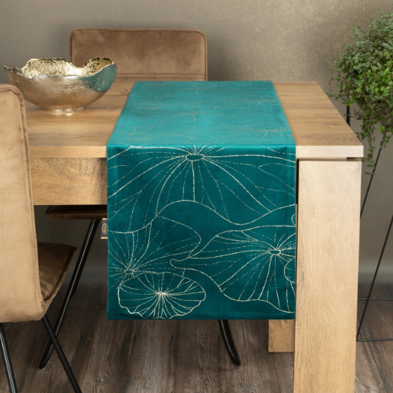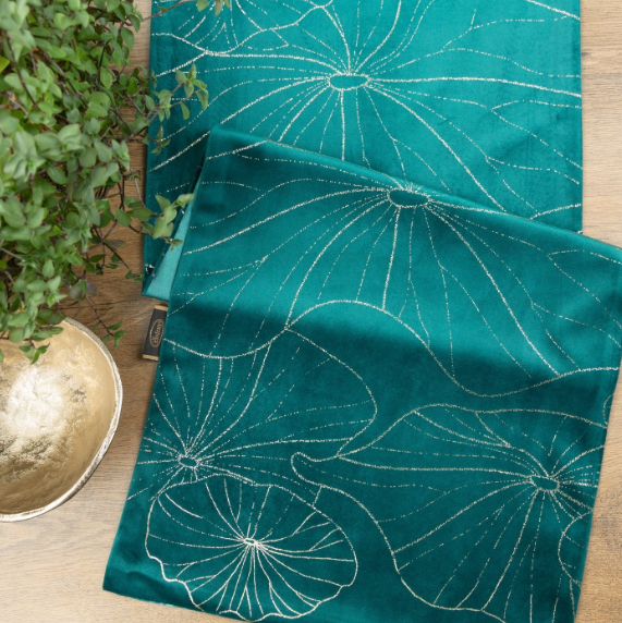 BLINK kolekcijos stalo takelis pagamintas iš minkšto ir malonaus liesti aksomo audinio ir dekoruotas vandens lelijos lapų raštu.