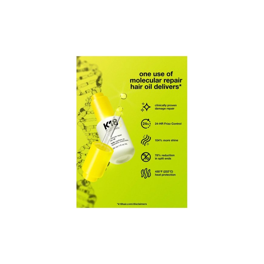 K18 Molecular Repair Hair Oil 30 ml — nourishing hair oil with an innovative formula that repairs damaged and brittle hair, leaving it soft, shiny, and manageable. Lightweight texture absorbs quickly without weighing hair down, protects against heat damage, and improves overall hair condition, giving shine and healthy appearance.
