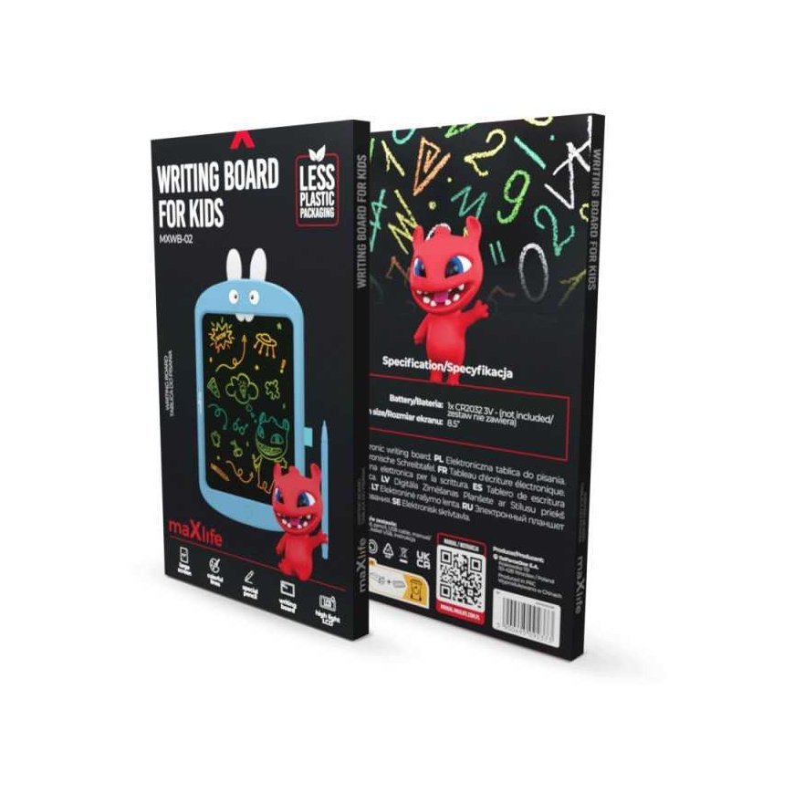 Maxlife vaikų rašymo lenta MXWB-02 yra specialiai vaikams sukurta programėlė. Lenta ne tik praktiška, bet ir įdomaus dizaino. Viršuje yra triušio ausys ir akys, kurios juda su lentos judėjimu ir suteikia linksmumo ir bendravimo. Rinkinyje yra pieštukas, leidžiantis lengvai ir tiksliai rašyti ir piešti ant lentos.