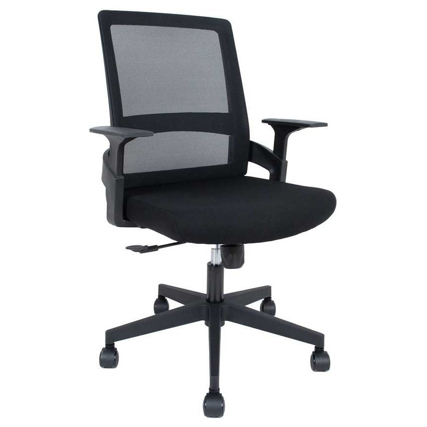 Task chair ROCK black. The comfortably shaped plastic backrest frame is covered with polyester mesh fabric. The padded seat is covered with polyester fabric. The armrests are fixed to the backrest. The chair has a lockable swing mechanism and a pneumatic seat height control. The 5-pronged footrest is made of black plastic, R32cm. The chair has plastic castors 50mm. The overall dimensions of the chair are 63x68xH93-103cm. Seat width 49cm, seat depth 48cm, seat height 44-54cm. The height of the armrest from the seat is 19cm. Weight limit 120kg.