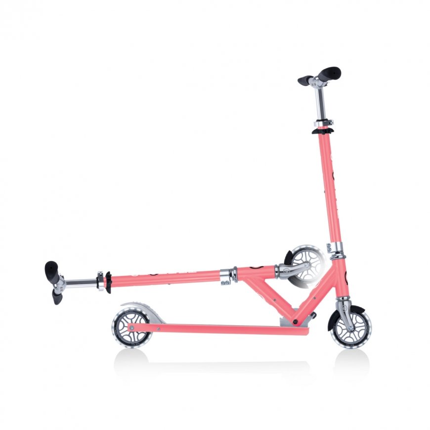 Lengvas, patvarus ir stilingas, paspirtukas siūlomas ryškiose spalvose, įskaitant koralinę rožinę. Jis turi patentuotą sulankstymo mechanizmą, reguliuojamą T formos vairą, neslystančią platformą, patikimą stabdį bei 125 mm LED ratus, kurie įsižiebia važiuojant. Tai puikus pasirinkimas kasdieniams nuotykiams.