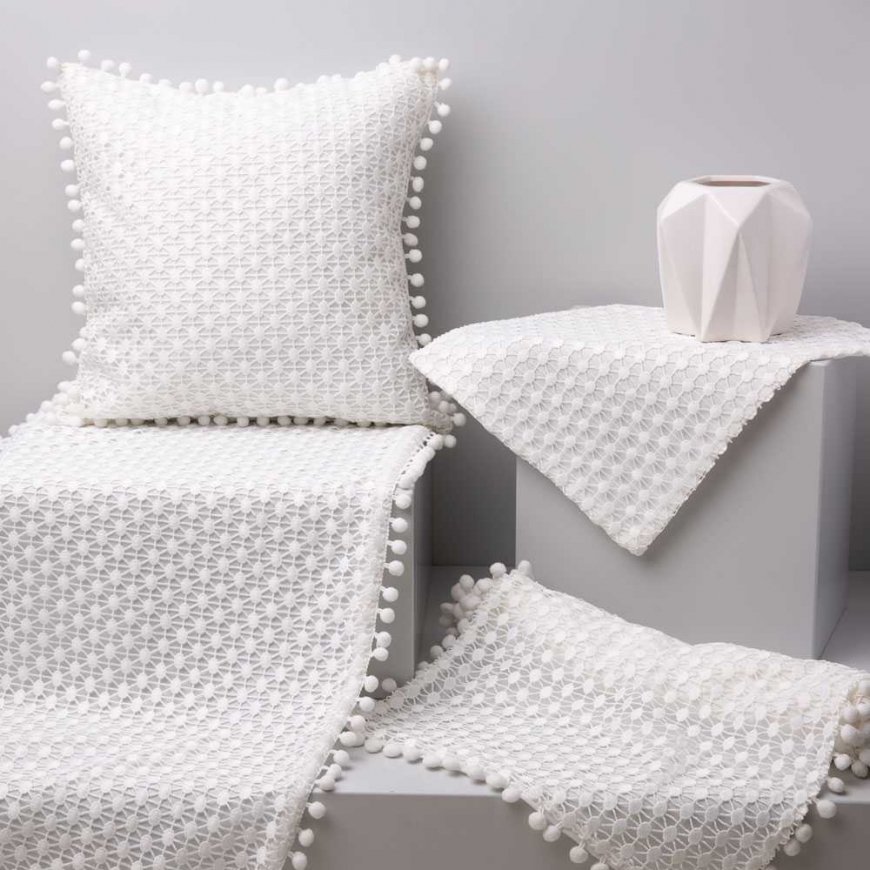 Komplet tekstyliów Lovely Dot ozdobiony pomponami i ażurowym wzorem. Tworzy gustowną i spójną ozdobę wnętrza. Umieszczając różne elementy kompletu w kilku miejscach mieszkania, kreujemy harmonię wystroju. Komplet wykonany jest z wysokogatunkowej tkaniny poliestrowej z bambusem, która zaskakuje delikatnością i miękkością. Bardzo trwała tkanina bambusowa jest antystatyczna, nie gromadzi kurzu ani roztoczy, dodatkowo ma właściwości bakteriobójcze i antygrzybiczne. Koronka wykonana z poliestru.W skład kompletu wchodzą:1 x Obrus1 x Bieżnik2 x Poszewka ozdobna4 x Serweta
