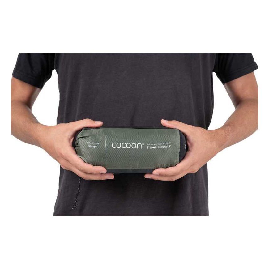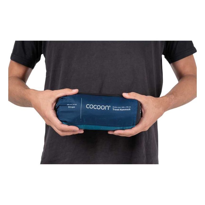 Dvivietis hamakas Cocoon, parduodamas komplekte kartu su pakabinimo diržais ir karabinais.