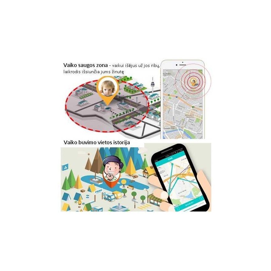 - Saugi zona: programėlėje galima nustatyti vaikui saugią zoną. Kai vaikas paliks šią zoną, laikrodis išsiųs pranešimą į programėlę.