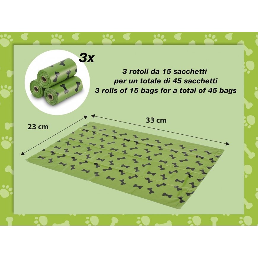 Contents: Each pack contains 3 rolls of dog poop bags of 15 bags each, for a total of 45 green bags with black bone printing. Keep out of reach of children.Scented: Dog poop bags have a pleasant scent that will make every moment spent with your dog enjoyable. Each bag measures 23 x 33 cm (width x length) to hold everything you need.