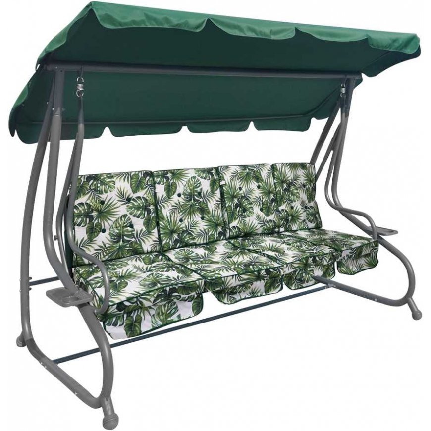 | Sėdynė pagaminta iš „Textilin“ medžiagos su 2x1 pynimu, Tinklelis pagamintas iš vinilu dengtų poliesterio siūlų. „Textilin“ skirtas naudoti lauke dėl didelio atsparumo atšiaurioms oro sąlygoms. Tinklelis yra itin lankstus ir atsparus tempimui, o tai papildomai turi įtakos naudojimo patogumui, o pati medžiaga nėra deformuota. daugiapakopis sklandus skydelio reguliavimas, Skėčio uždangalas pagamintas iš poliesterio, sveriantis 180 g. patogi sulankstoma sėdynė, kurią galima naudoti tiek sėdėjimui, tiek gulėjimui, 4 atskiros sėdynės, užpildytos apmušalų kempine, maždaug 6 cm pločio, 2 padėkliukai gėrimams, sūpynių tvirtinimas ant spyruoklių, konstrukcija pagaminta iš milteliniu būdu dažyto plieno, aukštos kokybės suvirinimo siūlės, didelis atsparumas oro sąlygoms, ant kojų galiukų masyvi neslystanti guma, lengva palaikyti švarą, sėdynių užvalkalai pagaminti iš poliesterio, sveria 160 g, maksimali apkrova 300 kg, | |