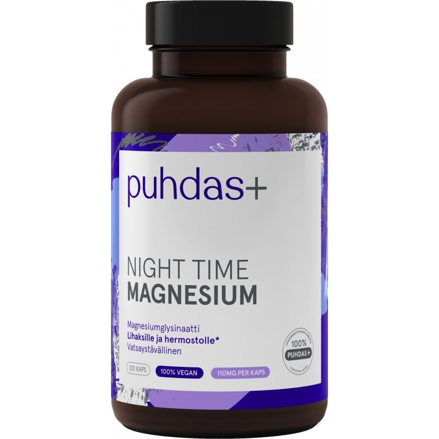 „Puhdas+ Night Time Magnesium“ yra sukurtas vartoti vakare. Jame yra gerai įsisavinamo ir skrandžiui draugiško magnio glicinato. Magnis skatina normalų raumenų ir nervų sistemos veikimą bei padeda sumažinti nuovargį ir išsekimą.