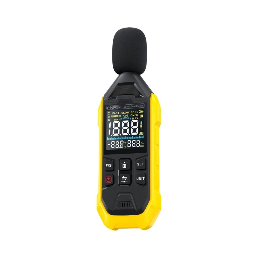FNIRSI FDM01 yra kompaktiškas decibelų matuoklis, kuris sujungia triukšmo matavimo funkciją 30-130 dB diapazone su tuo pačiu metu stebint temperatūrą ir drėgmę. Įrenginys turi jautrų kondensatorių mikrofoną, 2,3″ VA spalvinį ekraną su apšvietimu ir įkraunamą ličio bateriją (600 mAh), įkraunamą per USB-C. Su savo greitu atsaku, MIN/AVG/MAX matavimo režimais, šviesos alarmu ir dviem aptikimo režimais (GREITAI/LĖTAI), FDM01 FNIRSI bus naudingas biure, statybų aikštelėje, transportavime, gamybos patalpose ir viešosiose erdvėse.