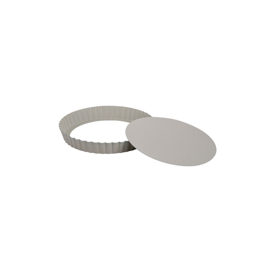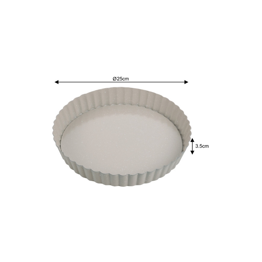 Kepimo forma, Ø25 cm, KH 1969, KINGHoff. Su išimamomis dugnu, kuris leidžia patogiai ir saugiai išimti tarte nepažeidžiant pagrindo. Nelipni marmurinė danga reikalauja mažiau riebalų, lengvina valymą ir neleidžia tešlai prilipti. Pagaminta iš anglinio plieno, pasižyminčio puikiu šilumos laidumu ir tolygiu kepimu. Atspari karščiui iki 220°C, tinkama standartinėms kepimo sąlygoms. 3.5 cm aukščio banguotas kraštas suteikia pyragams elegantišką formą. 25 cm skersmuo – praktiškas šeimos dydis, puikiai tinka tartėms ir kišams.