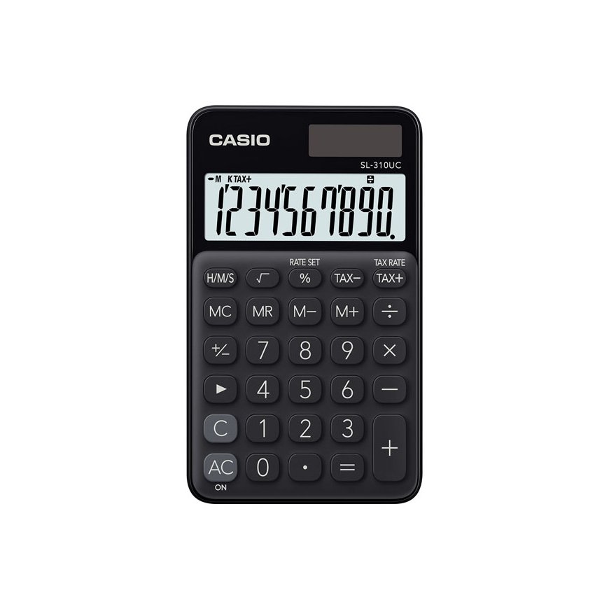 Casio SL-310UC-BK. Formas faktors: Kabata, Tips: Pamata kalkulators. Cipari: 10 cipari. Nodokļa aprēķins, Peļņas aprēķins. Jaudas avots: Baterijas / Saules. Produkta krāsa: Melns