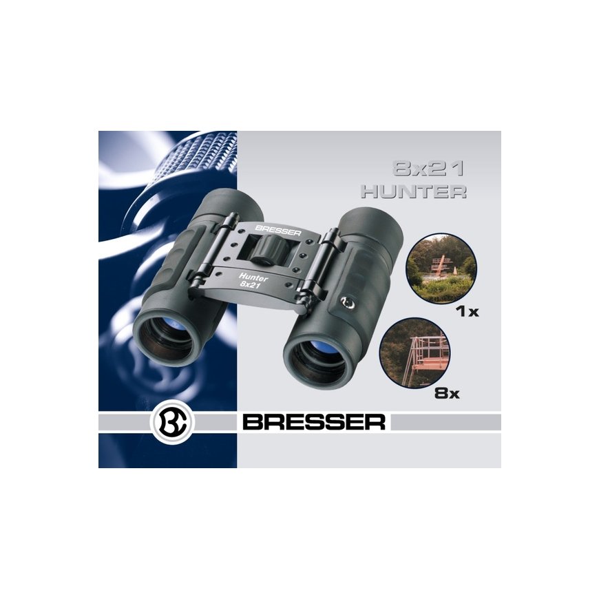 Bresser Optics Hunter 8x21. Pastiprināšana: 8x, Objektīva diametrs: 2,1 cm, Prizmas tips: BK-7. Svars: 188 g. Dimensijas (WxDxH): 90 x 100 x 33 mm