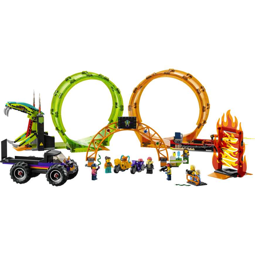 • Real trick adventures for kids - create a venue for exciting trick shows and competitions with the LEGO® City two-loop trick arena (60339) • What's in the box? - This play triathlon set includes an arch gate, a stomach loop, a fire loop, a flame wall, a giant truck, a sales counter, a spectator platform, two stunt motorcycles and seven minifigures • Fun Features - Kids activate flywheel motorcycles for tricks to ride through a flame wall, ride through a gripping stomach loop and light a ring of fire • Gift for children who love adventure toys - this LEGO® City Stuntz toy set can be given as a holiday, birthday or other occasion to children from 7 years of age • Dimensions - the arena comes with several accessories, including a loop of fire, and is over 20 cm high, 16 cm wide and 34 cm deep • Fun LEGO® Accessories - The Stuntz Play Kit includes great accessories, including juice ice cream, lemonade and a camera • Construction pleasure for adventurers from the age of 7 - printed construction instructions are easy to follow for each model • Creative Toys - The LEGO® City Stuntz Play Kit invites children to adventure amidst buildings, vehicles and characters that inspire them to play creatively • Quality guaranteed - all LEGO® components meet the industry's highest standards to ensure stable quality, compatibility and a fun construction experience - since 1958 • Safety first - LEGO® parts are dropped, heated, crushed, twisted and analyzed. This way you can be sure that they meet strict global safety standards It consists of 598 parts