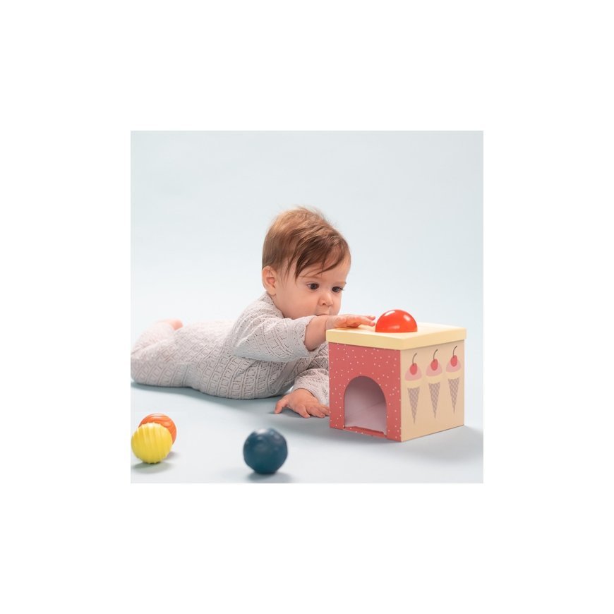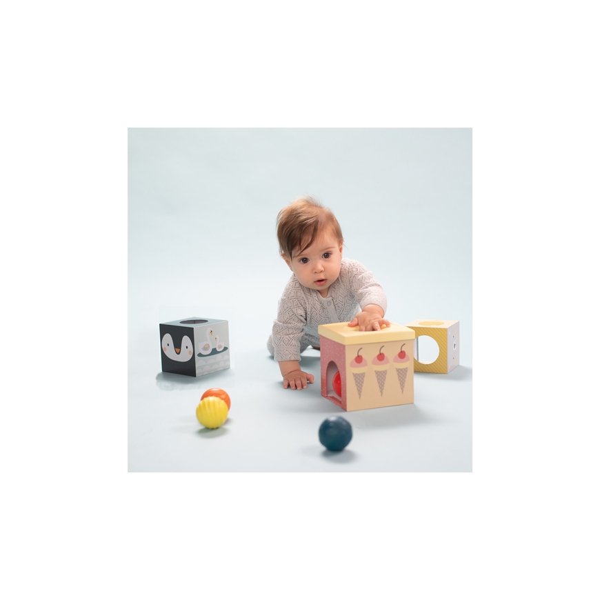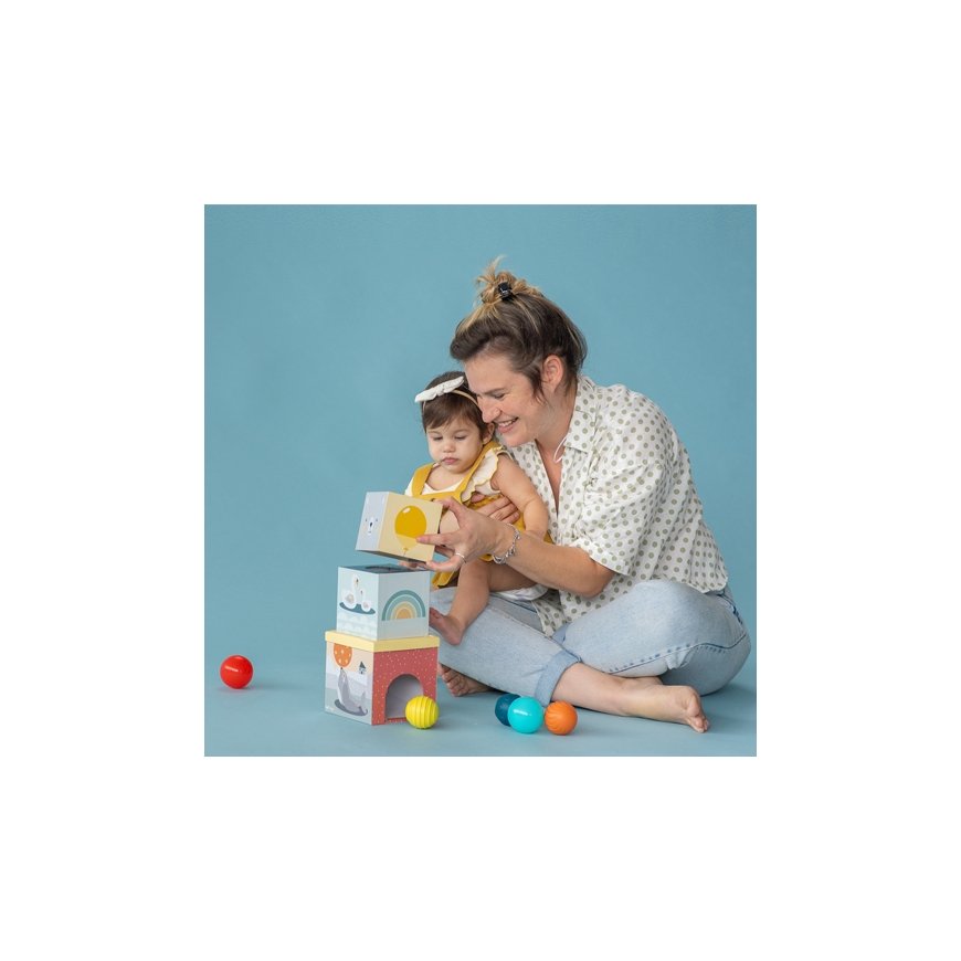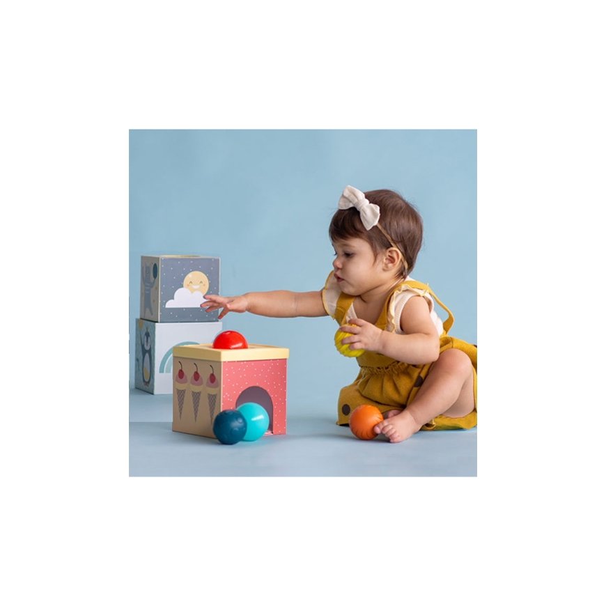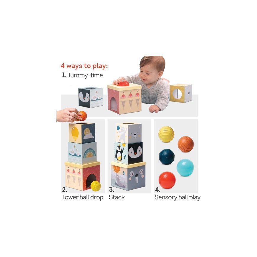 The Taf Toys North Pole Ball Drop tower toy inspires building a tower and placing different balls inside the tower pieces. The tower consisting of three boxes can be stacked on top of each other or played separately. Five balls with a smooth or patterned surface are included.