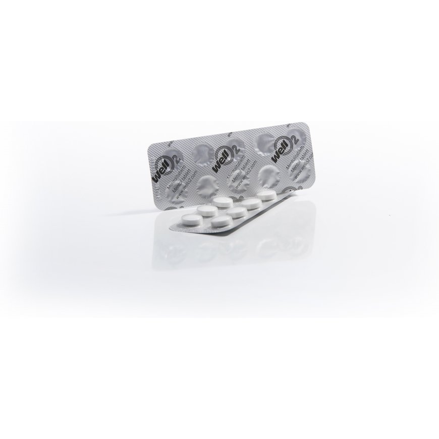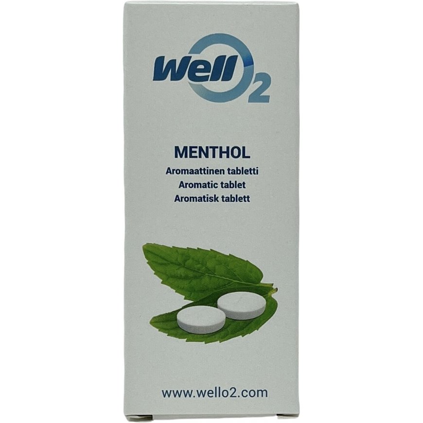 Aromatic tablets intended for the WellO2 breathing device, refreshing the respiratory tract, to support breathing training. Can also be used with a nasal mask. Enjoy dissolved in water. Use also for steam inhalation.