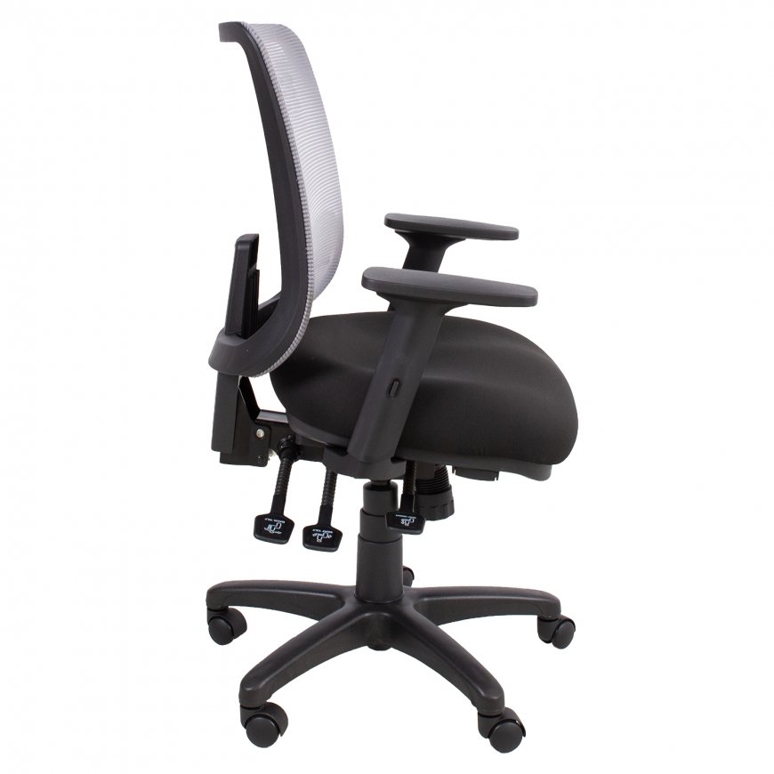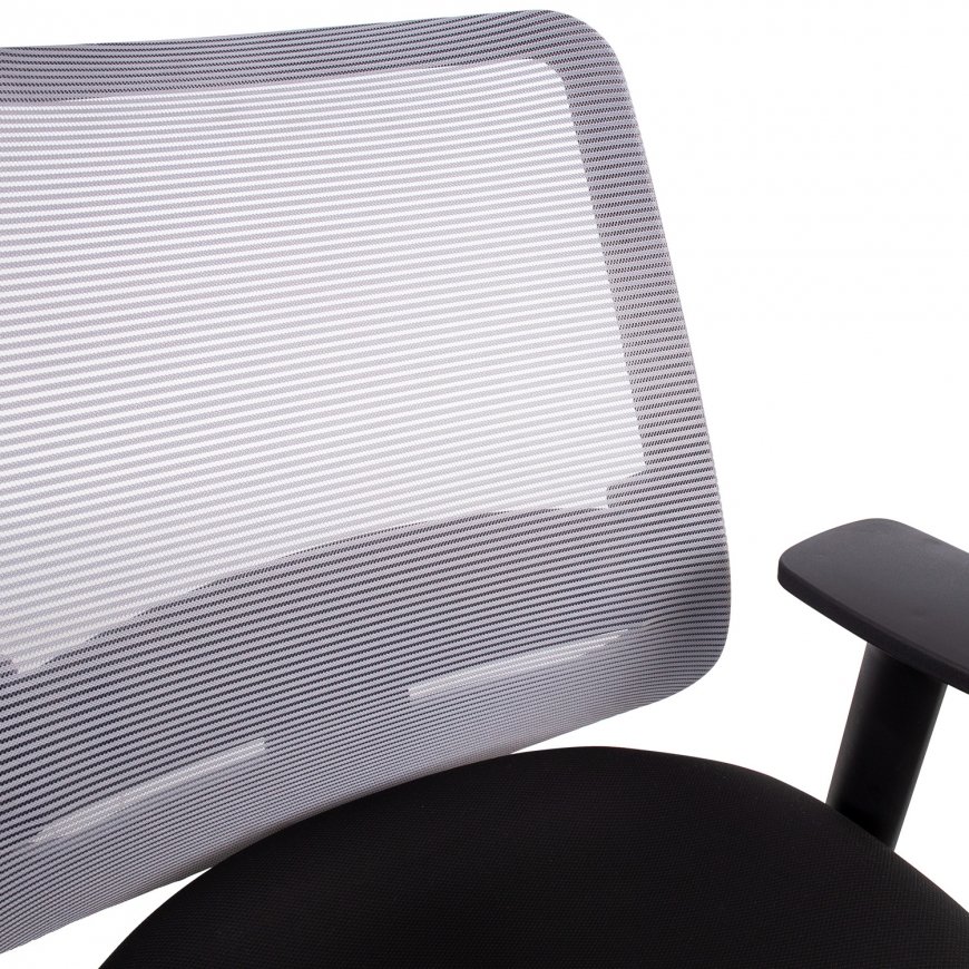 Darba krēsls SAGA melns/pelēks. SAGA ir izturīgs un ergonomisks darba krēsls, kas nodrošina ērtu darba stāvokli visas dienas garumā. Krēslu var noregulēt atbilstoši katra lietotāja vēlmēm un vajadzībām. Sēdvietas pārvalka materiāls: poliestera audums, 50 000 Martindale cikli. Muguras daļa ir pārklāta ar poliestera sieta audumu, kas nodrošina labu gaisa ventilāciju. Regulējams jostas vietas atbalsts. Mehānisms un funkcijas: daudzfunkcionāls mehānisms. Iespēja patstāvīgi pielāgot sēdvietu un atzveltni. Muguras balsta augstuma regulēšana 48-55,5cm, atzveltnes leņķis ir regulējams un bloķējams. Pielāgojams sēdvietas dziļums un slīpuma leņķis (sēdvietas priekšējais slīpums). Pneimatiska sēdvietas augstuma regulēšana. Trīs virzienos regulējami melni plastmasas roku balsti: augstuma regulēšana 17,5–27,5 cm, dziļuma un leņķa regulēšana. Polipropilēna melna, 5-zaru pamatne D64cm, 50mm plastmasas ritentiņi. Izmēri: augstums 94,5-114cm, sēdvietas augstums 46,5-58,5cm, sēdvietas dziļums 43-48cm, sēdvietas platums 48cm. Maksimālais svars 120kg.