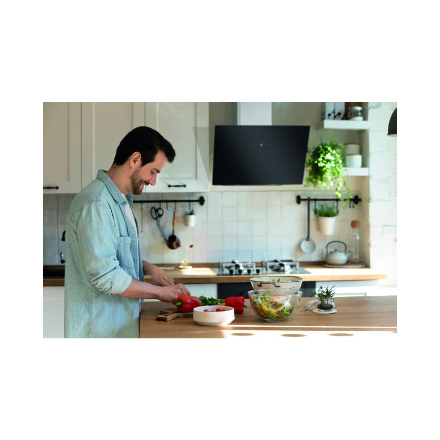 Bomann gaisa attīrītājs ar slīpu stiklu A++ enerģijas klase . Gaisa attīrītājam ir mūsdienīgs un minimālistisks dizains, pateicoties kuram to ir viegli saskaņot ar pārējām mēbelēm un tehniku. Priekšējais panelis ir izgatavots no stikla, un sensoru slēdžu fons ir gaiši zilā krāsā. LED apgaismojumam ir silts balts tonis, kas nodrošina labu redzamību, bet nekairina acis.