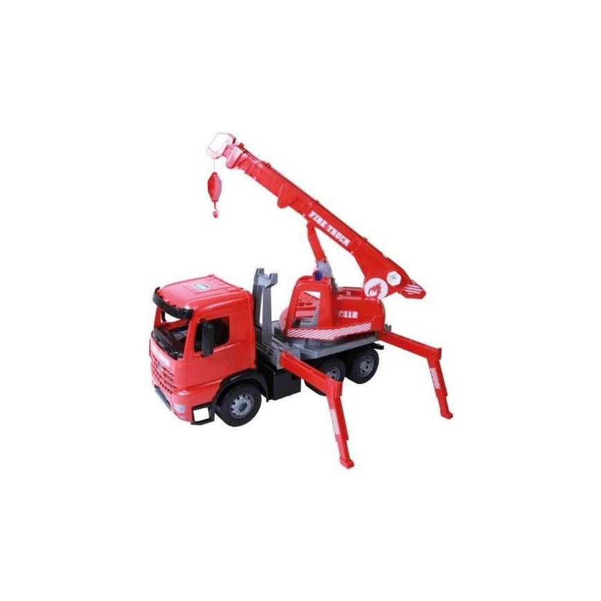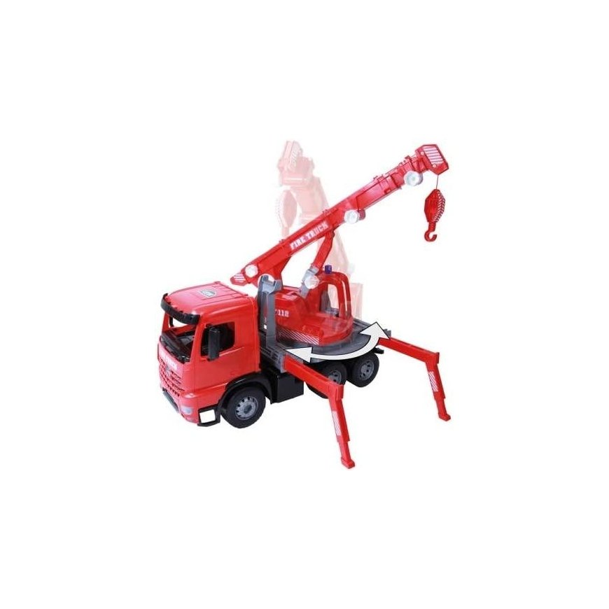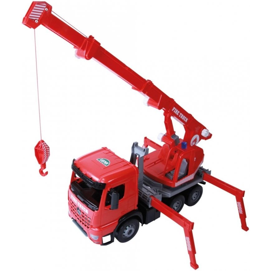 Lena Giga Trucks Arocs fire truck with stickers, red, modern detailed design, realistic colors, Mercedes Actros chassis, 3-stage lifting arm, extendable up to 105 cm with cable winch, 270 ° rotating crane structure, with 4 with expandable supports and 2 wedges to stabilize the wheels, 70 cm long. Suitable for children from 3 years. Suitable for indoor and outdoor use.