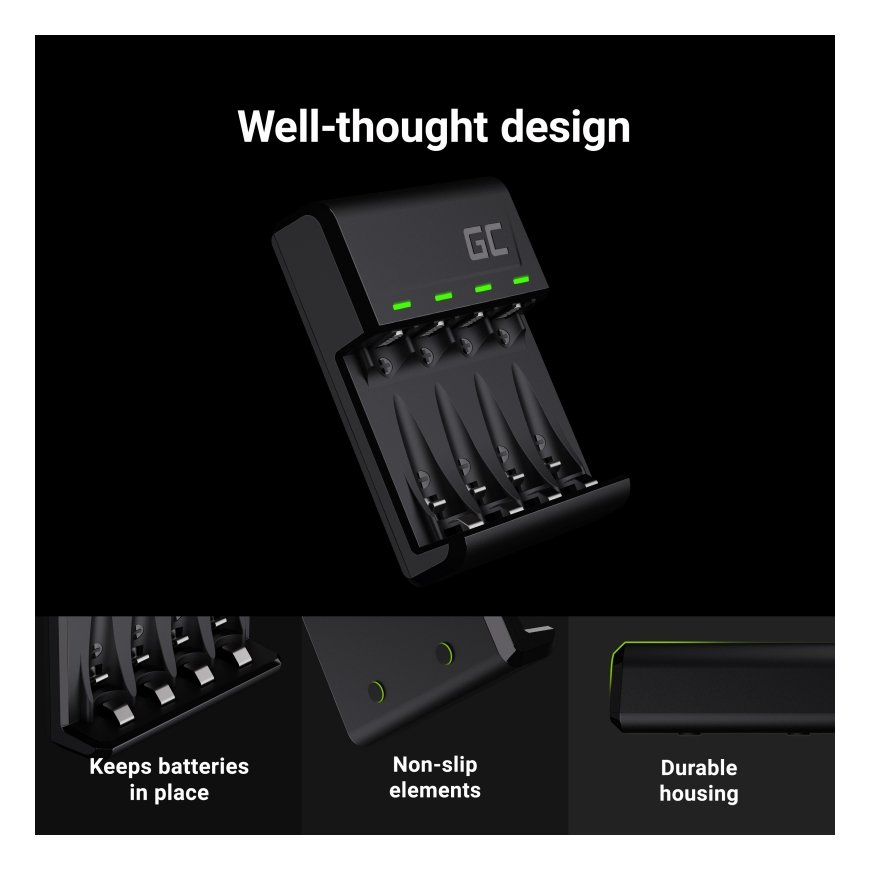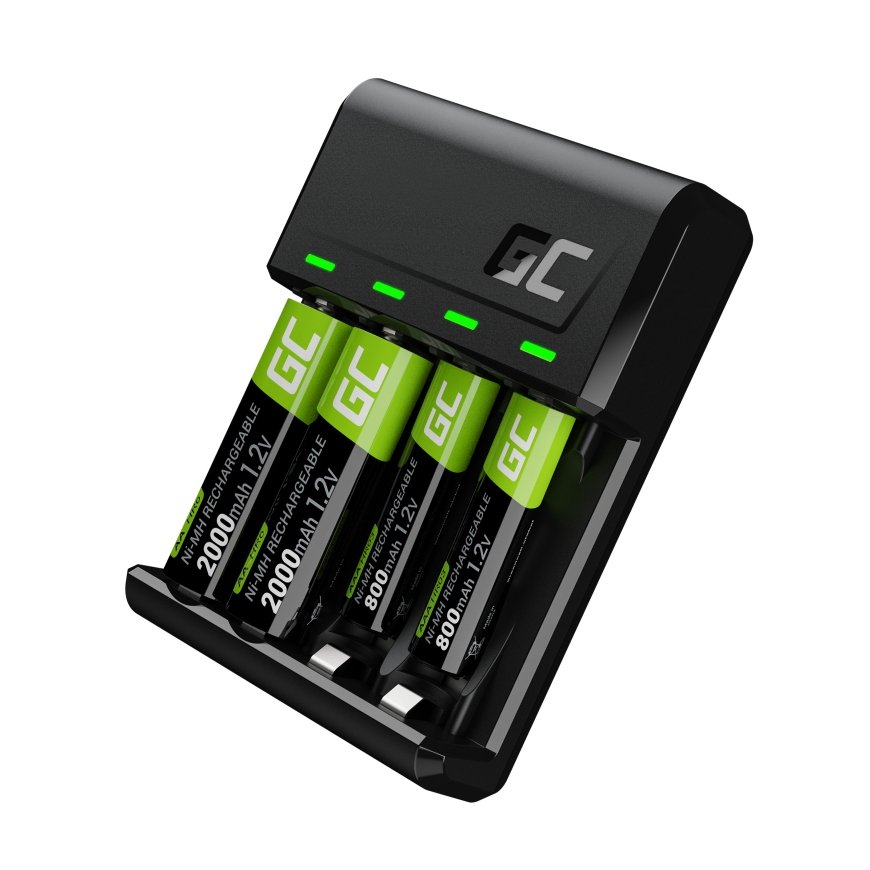 Green Cell GRSETGC03. Piemērots: Universāls, Barošanas avota veids: USB, Savietojamu bateriju tehnoloģijas: Niķeļa-metāla hidrīda (NiMH). Produkta krāsa: Melns. Enerģija patēriņš: 0,5 W, Uzlādes spriegums: 1.5 V, Uzlādes strāva: 1,2 A. Baterijas veids: AA, 2. akumulatora izmērs: AAA, Baterijas performance: 2000 mAh. Skaits iepakojumā: 1 pcs