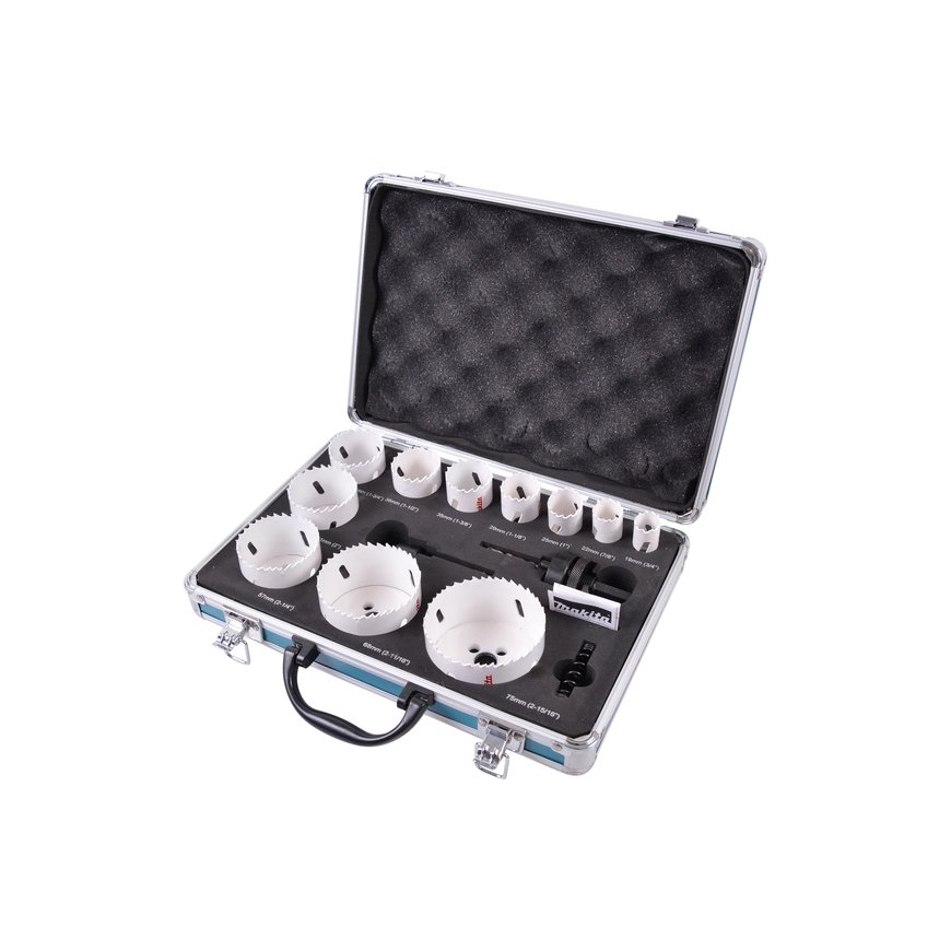 Makita D-47298. Tips: Komplekts, Piemērots materiāliem: Metāls, Koks, Caurumu zāģu komplektā izmēri: 19,22,25,29,35,38,44,51,57,68,75 mm. Gabalu skaits: 14 pcs, Cilindrisko zāģu skaits: 11 pcs| Tips | Komplekts |