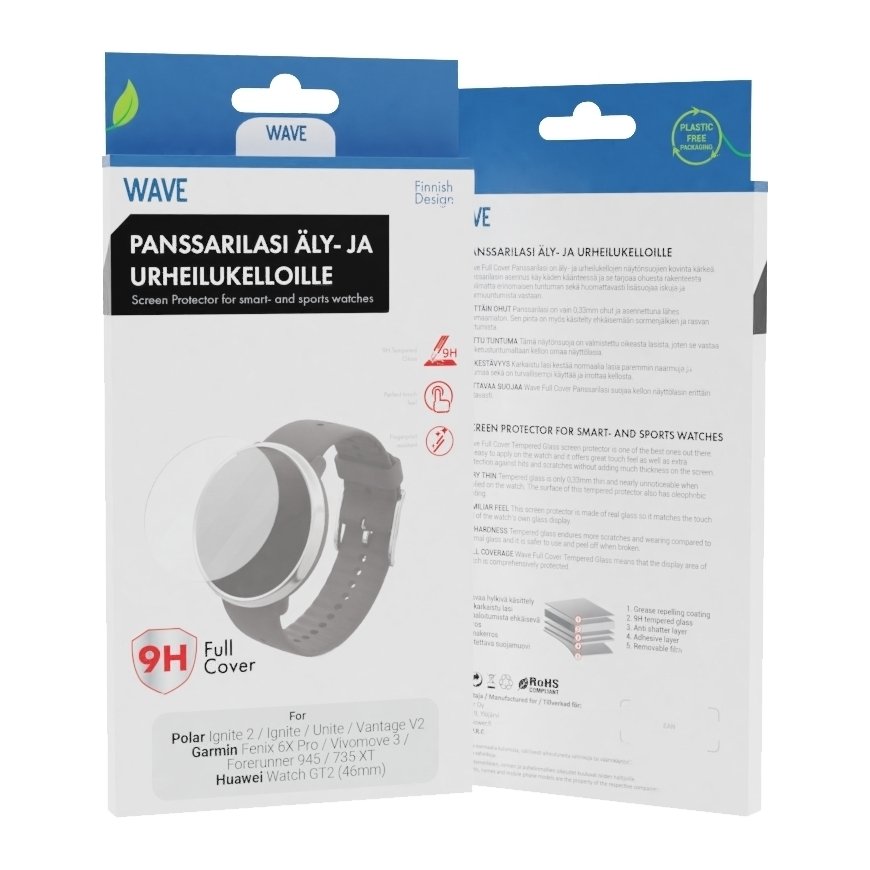 Wave Full Cover is the toughest tip screen protector for smart and sports watches. The installation of the armored glass is a snap and, despite its thin construction, it offers an excellent feel and considerably additional protection against shocks and scratches. The package includes one glass and cleaning supplies.