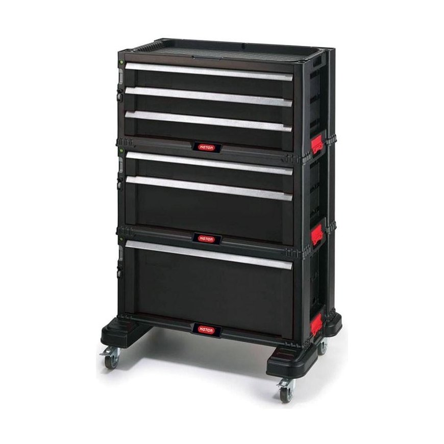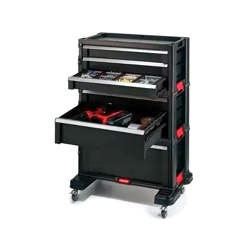The system consists of several drawers of different sizes, in which large construction tools and very small parts can be placed. The drawers are pull-out, allowing full access to the contents, and the drawers are easy to transport thanks to the rolling wheels and side handles.
