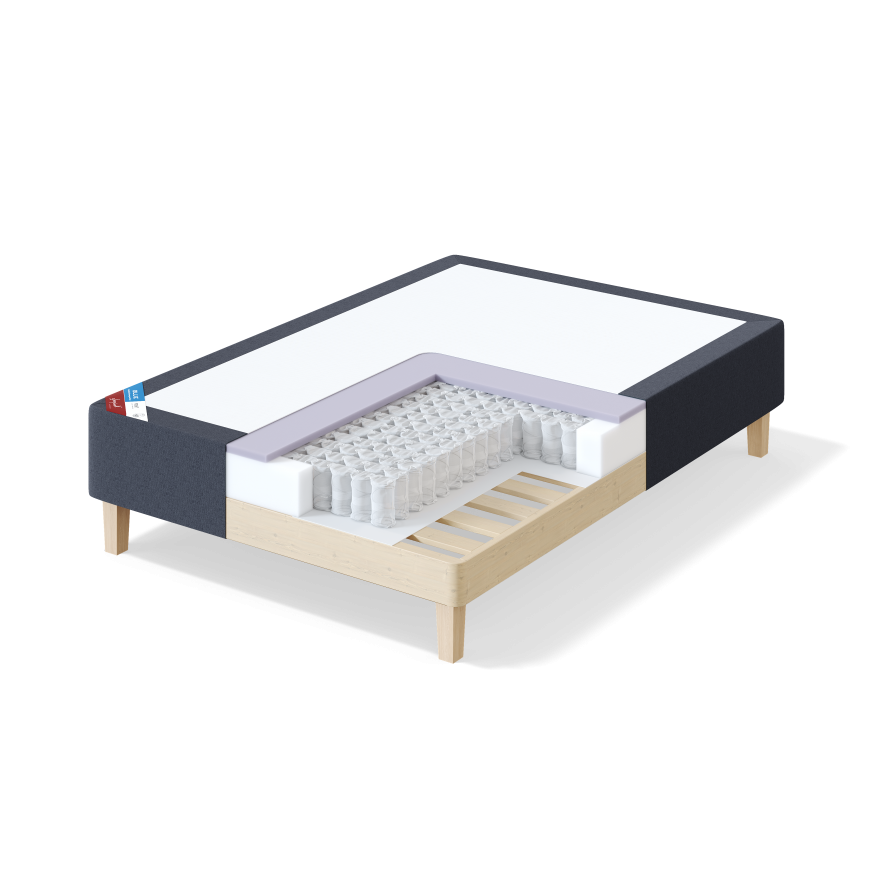 Ar mēbeļu audumu pārklāta gulta ar stingru atsperojumu. Papildkomfortu nodrošina augstas kvalitātes porolona slānis, ar kuru pārklāta pakoto atsperu sistēma. BLUE sērijas mēbeļu auduma izvēle ir pieejami 3 dažādu toņu audumi - pelēks, tumši pelēks un bēšs. Papildus var pasūtīt ar tādu pašu audumu pārklātu gultas galvgali. Piedāvājumā ir 3 dažādi galvgaļi.