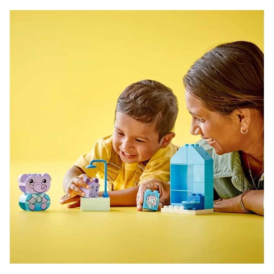 Help preschoolers 18 months and older understand the emotions of bathing with the My First Daily Routine: Bathing toy for toddlers (10413). This animal set includes 2 toy elephants - a mother and child, plus a bath, shower and toilet. Parents and preschoolers join their new LEGO® DUPLO® animal friends in the bathroom for fun role-play as they bathe the elephant and learn why daily bathing is so important.