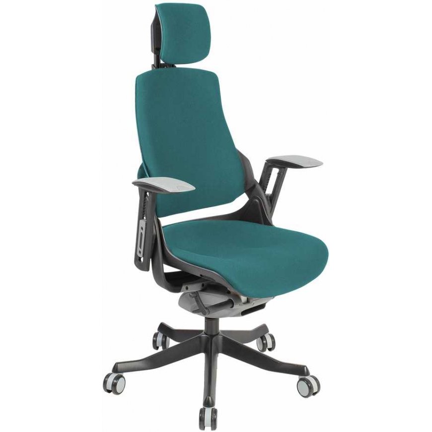 Task chair WAU teal blue. The WAU chair combines excellent ergonomics and sporty style, offering the best support and performance for a whole working day. The outer shell of the chair is made of black plastic and the inner parts of the frame are molded from gray plastic (100% PP recyclable). The backrest frame is fiber reinforced. The upholstered seat and backrest of the chair are covered with teal blue polyester fabric, Martindale value 50,000. The chair has a synchronized mechanism with adjustable tilt tension, and tilt lock control. Pneumatic seat height adjustment. The height of the headrest and backrest is adjustable. The chair has adjustable lumbar support. The armrest covers are made of gray elastomer thermoplastic. The height and angle of rotation of the armrests are adjustable. The chair's 5-prong base is made of diecast aluminum alloy and finished in black epoxy powder coating. The chair has 60mm floor-saving nylon castors. The overall dimensions of the chair are 70x70xH112-129cm. Seat width 47cm, seat depth 49cm, seat height 40-48cm. Weight limit 120 kg.