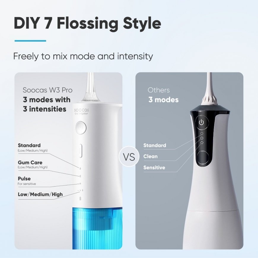 The device is equipped with an intelligent chip, which is responsible for its precise yet efficient operation. The irrigator pulses at a speed of up to 1,300 times per minute, ensuring optimal cleaning. The Soocas W3 allows water to flow steadily through the crevices between teeth, so dirt is rinsed away quickly and effectively. The device removes as much as 99.9% of plaque, helping to keep your smile in excellent condition. It also reduces the risk of bleeding gums and inflammation. It also helps remove tartar and stimulates blood microcirculation in the gums, promoting oral health.
