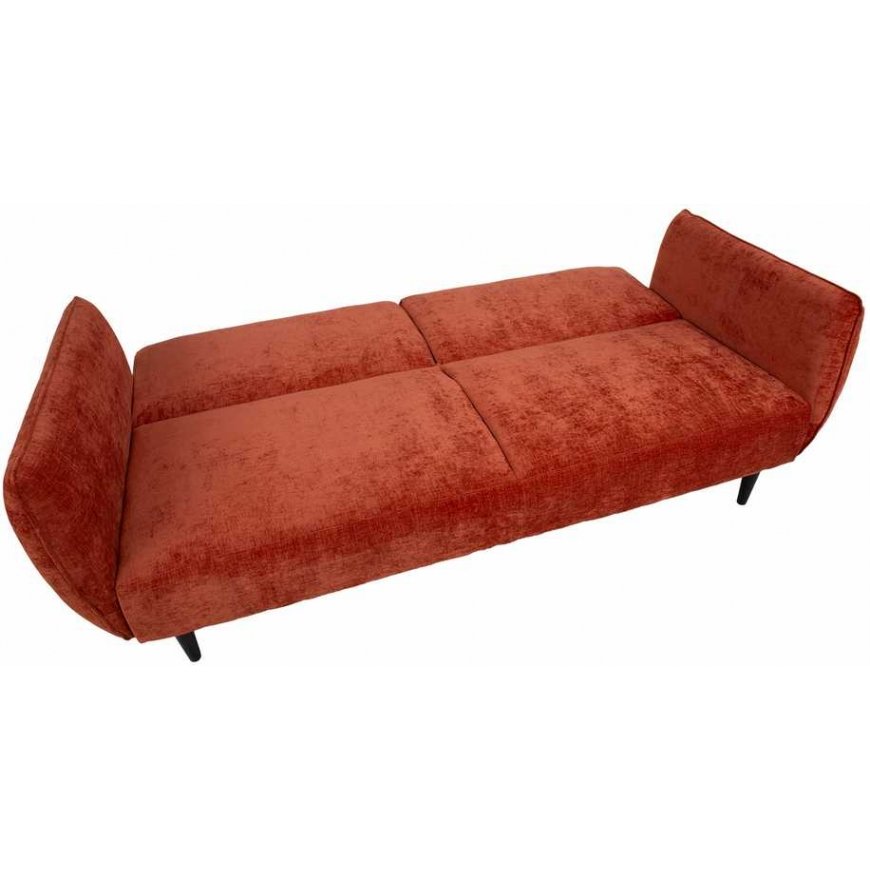 Sofa bed HERMES 3-seater, orange. The fold-out sofa with a click-clack mechanism is a good solution for creating additional sleeping space. The sofa is covered with velvety polyester fabric, and the frame is made of solid wood. The seat base is supported by zig-zag springs and webbing. The padding is made of polyurethane foam with a density of 23kg/m³. Before placing the backrest in a horizontal position, open the zipper pockets on the back of the backrest and pull out the metal support legs. The overall dimensions of the sofa are 216x91xH83cm. Seat width 186cm, seat depth 60cm, seat height 42cm. The height of the armrest from the ground is 76cm. The dimensions of the sleeping area when opened are 186x112x47cm. The sofa has dark wooden legs H20cm.