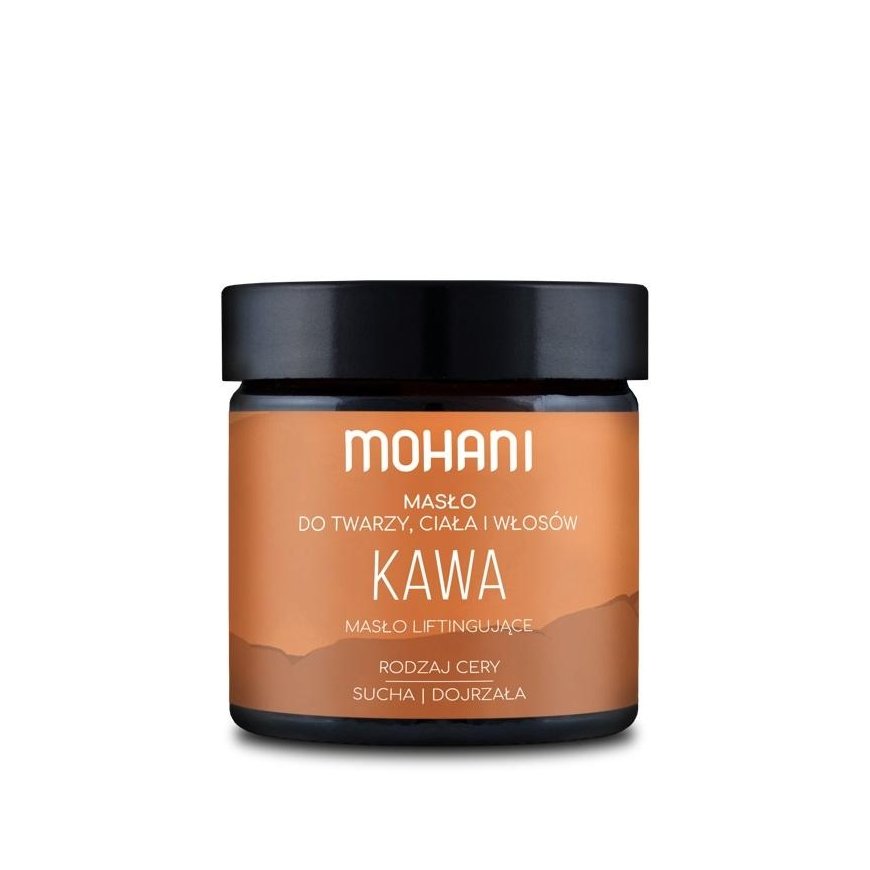 Mohani Coffee Butter Capacity: 60 ml Mohani Coffee Butter has a soft consistency and a very pleasant coffee aroma. Natural coffee butter is extremely versatile and versatile - it can replace several cosmetics on the bathroom shelf. Can be used under the eyes, face, body skin and hair. It supports skin regeneration, perfectly softens and restores elasticity. Due to the caffeine content, it evens out skin tone (e.g. under the eyes) and improves firmness (e.g. on the thighs). Why should you use coffee butter? it has a warming effect and stimulates fat burning processes, deeply nourishes, moisturizes and lubricates the skin, improves its tension , stimulates regeneration processes, Due to the high content of antioxidants, it has anti-aging properties, reduces the visibility of dark circles under the eyes, brightens the appearance. INGREDIENTS: Prunus Amygdalus oil, Coffea Arabica seed oil*, hydrogenated vegetable oil.* unrefined