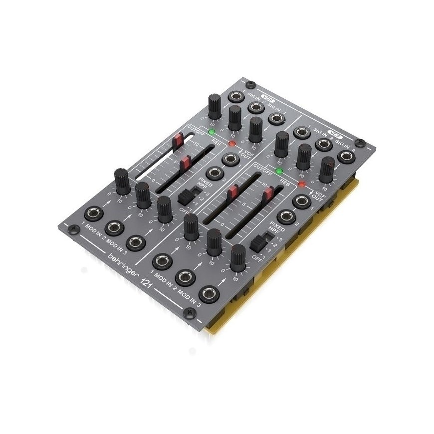Behringer 121 Dual VCF - legendary analog dual VCF module in eurorack format Key features: Classic dual VCF module from the 80s Authentic reproduction of the original System 100M circuit 2 low pass filters with cutoff and resonance frequency controls Each filter has 3 audio outputs and 3 CV inputs with attenuator Each VCF includes an optional switchable high-pass filter with 3 modes 3-channel mixer VCF allows you to mix all input signals separately 18 controls and switches provide real-time access to all important parameters Eurorack specs: 16 HP, 40 mA +12 V, 40 mA -12 VMade in UK