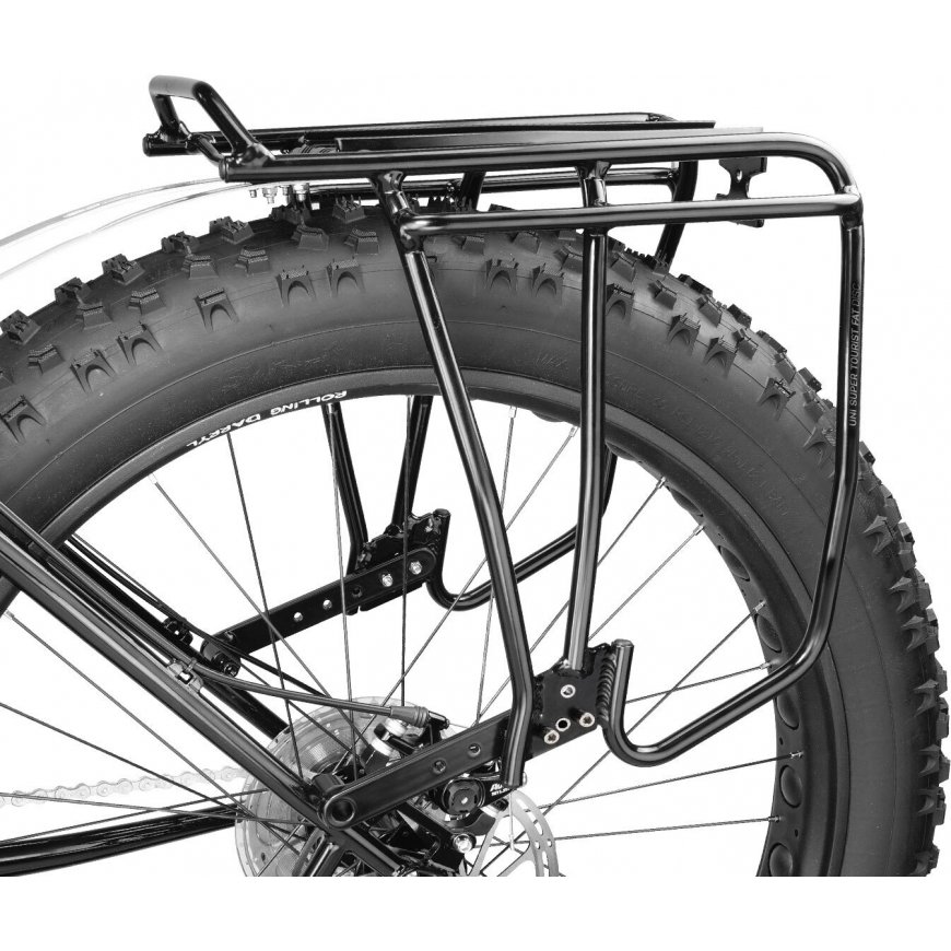 Maksājumi 5x21.80€High-quality and sturdy luggage rack for fat bikes. Sturdy and widely adjustable, e.g. the extra long upper stirrups and the lower stirrup can be turned at an angle.