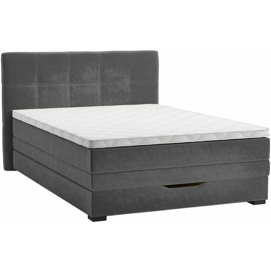 Continental bed JEEP with storage box 120x200cm, grey. The bed frame and headboard are covered with a velvety polyester fabric, Martindale value 105,000, 370g/m². The base frame of the bed includes a spacious storage compartment that opens from the footboard. The base frame is made of furniture board. The sides of the mattress base frame are made of wood, with an 80mm bonnell spring unit inside. The mattress contains 120mm pocket springs, covered with a 3cm layer of polyurethane foam with a density of 25kg/ m³. The mattress topper is made of polyurethane foam 25kg/m³, 4cm thick. The overall dimensions of the bed are 210x130xH55/107cm.