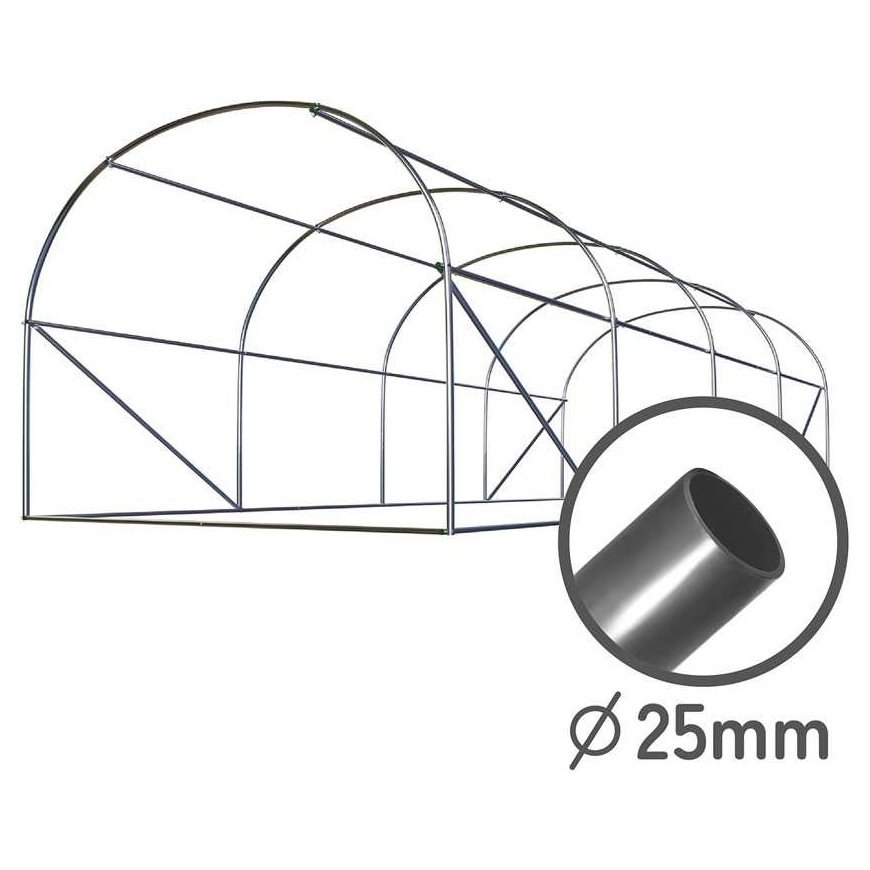 GARDEN FOIL TUNNEL 10m2 dimensions: 250cm x 400cm x 200cm, entrance dimensions 80 cm x 180 cm, coating weight: 140 g/m2 - ensures durability for many seasons, opening with sewn-in zipper, steel profiles, galvanized on both sides 25 x 0.7 mm, 8 windows with mosquito nets. You will receive FREE: 5 stakes for verticalizing plants, 100 m sisal twine, 4 pegs, 4x260 cm white ropes. Why is pink light important? The pink shade of the foil enriches the spectrum of red and blue light, which stimulates the process of photosynthesis and fruit development. Tomatoes grown in garden tunnels with such foil often have a more intense color, better taste and higher sugar content. Pink foil accelerates flowering due to the increased proportion of red light. Pink foil can increase crop yield and quality. Pink foil is ideal for demanding fruit crops such as tomatoes. Durable construction The frame is made of technologically advanced, double-sided galvanized, 25 mm steel profiles. Double profiles at the top of the tunnel provide additional stabilization of the tunnel. Velcro windows with mosquito nets The tunnel has 8 windows, 4 on each side wall, more sunlight enters through the windows, the windows allow you to check the crops without opening them and without entering the garden tunnel, the windows were protected with mosquito nets. Foil coating The foil coating is made of PE material with a weight of up to 140 g/m2 - due to this, our plants are well protected from wind and other external factors, low light reflection coefficient ensures high solar radiation transmission!,Due to the properties of the material from which the cover is made, we can tension and adjust it accordingly,In addition, the tunnel was finished at the bottom with an "apron", which, when covered with soil, protects the foil from blowing away,The foil opens with a zipper.Verticalization/plant support pole set, 100 m sisal twine, twines (4x pegs and ropes 260 cm long) FREE OF CHARGE!Twine is perfect for plants, such as tomatoes, tied in foil tunnels.Durable steel poles, 120 cm long, covered with plastic coating, with a sharp spike at the end, making them easier to hammer into the ground.Useful pegs and ropes for additional protection of the tunnel from windTECHNICAL DATAwidth: 250 cmlength: 400 cmheight: 200 cmarea: 10 m2door width: 80 cmdoor height: 180 cmnumber of windows: 8 pcs.steel profiles, galvanized on both sides 25 x 0.7 mmPE foil 140 g/m2 UV4 resistant, pinkentrance with zipper