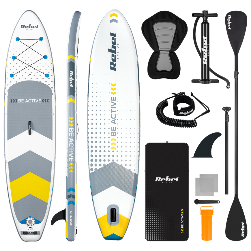 Komplektā ietilpst: 1 spuras, pavadiņa, airis, kajaka sēdeklis, rokas sūknis, mugursoma pārvadāšanai, remonta komplekts (plāksteri, vārsta atslēga)