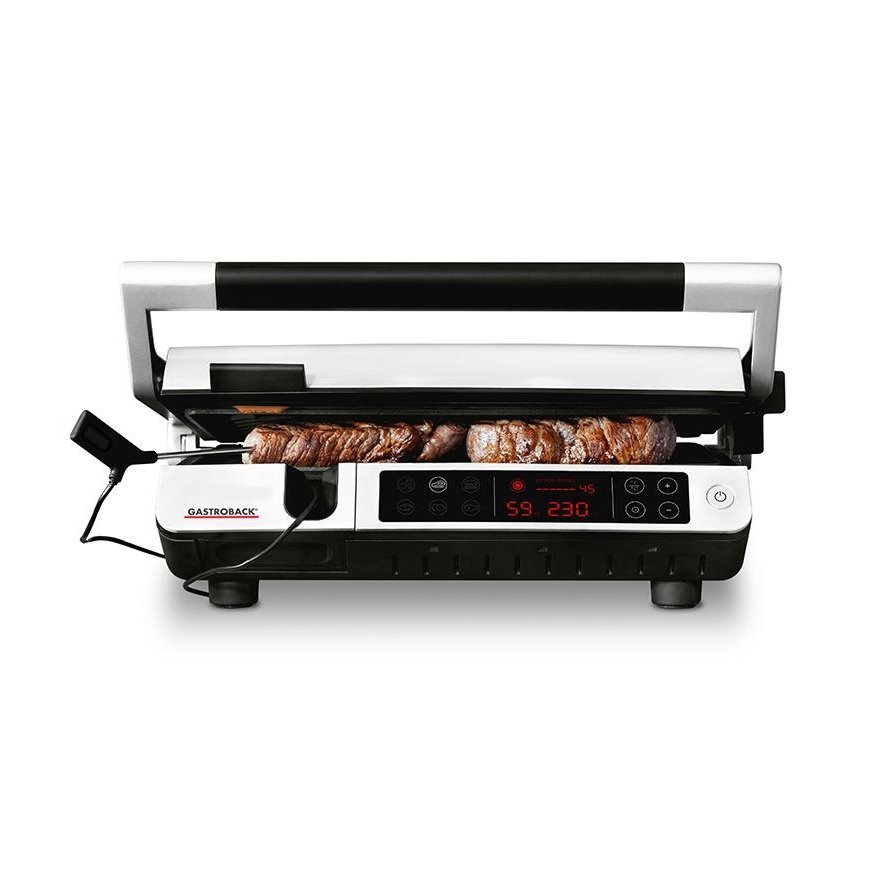 Gastroback Design BBQ Advanced Control. Produkta krāsa: Melns, Balts, Formas faktors: Taisnleņķa, Kontroles tips: Ar pieskārienu. Jauda: 2000 W, Maiņstrāvas ievades spriegums: 220-240 V, Maiņstrāvas ievades frekvence: 50-60 Hz. Auklas garums: 0,9 m, Platums: 430 mm, Dziļums: 345 mm