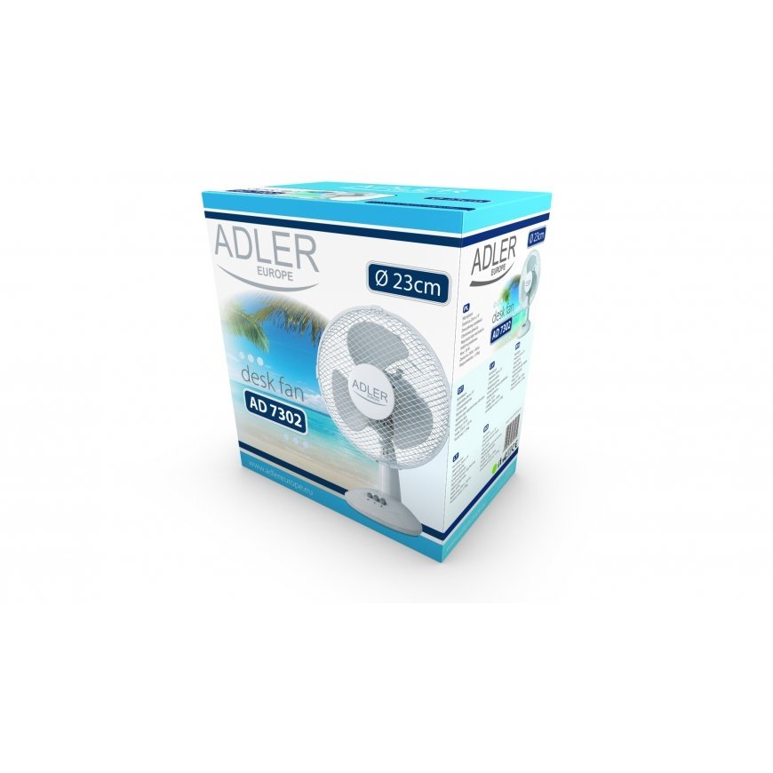 Adler AD 7302. Produkta krāsa: Balts, Izvietošana: Galds, Trokšņu līmenis: 35,6 dB. Enerģija patēriņš: 35 W, Jaudas prasības: 230 V, 50 Hz. Svars: 1,23 kg. Iepakojuma dimensijas (WxDxH): 280 x 185 x 313 mm, Iepakojuma svars: 1,4 kg