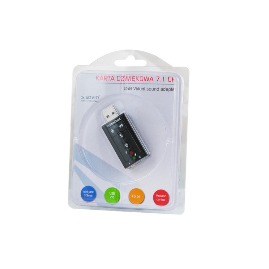 Savio AK-01. Audio izvades kanāli: 7.1 kanāli, Audio kvalitāte: 16 bit. Saimnieka interfeiss: USB. Produkta krāsa: Melns