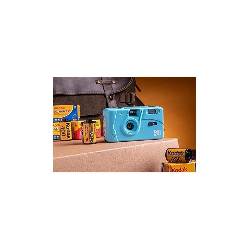Capture memories with this reusable camera that uses 35mm film. The M35 has a fixed focus lens, manual film rewind and rewind, and a flash on/off switch. Just buy a 35mm photographic film, load it, take a picture, rewind and highlight the contents of the film. Have fun with the classic mint green Kodak M35 film camera!