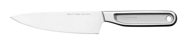Made from the purest, high-quality stainless steel, the Fiskars All Steel small chef's knife has exceptional features and durability. Features an extremely strong blade that excels in almost all cutting tasks. Japanese multi-carbon steel provides exceptional durability, while the one-piece cast construction is beautiful and timeless. Thanks to the optimal balance, cutting is comfortable and natural. Hand washing is recommended. Made in Finland.