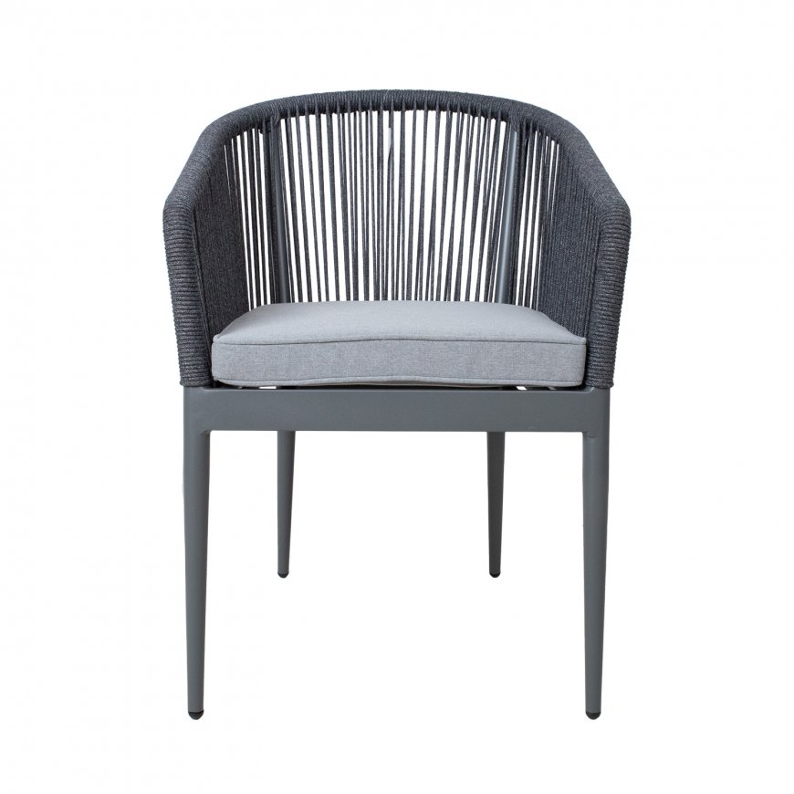 Стул ECCO, серый. Каркас кресла изготовлен из алюминия и покрыт серой порошковой краской. Спинка и подлокотники кресла обиты простой веревкой. Подушка входит в комплект. Чехол на подушку изготовлен из полиэстера. Размеры подушки сиденья 45x42x5см. Основание сиденья поддерживается алюминиевыми планками. Размеры кресла 57x65xH8см, предельный вес 100кг. Стулья можно штабелировать, их легко хранить и экономить место. Продукт долговечен в меняющихся погодных условиях и очень прост в уходе. ХРАНЕНИЕ: в конце летнего сезона рекомендуем хранить садовую мебель в помещении. Очистите и высушите мебель перед хранением. Используйте для хранения прохладное, сухое, хорошо проветриваемое помещение.
