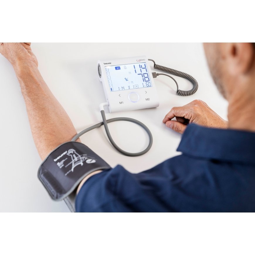 Оплати 5x25.80€The Beurer BM96 Cardio is a 2in1 device that measures upper and lower blood pressure and heart rate from the upper arm and also records the electrocardiogram, or ECG. The large cuff (22–42 cm) fits even a thicker arm. The device is easy to use with four touch buttons. You get the measurement results quickly and they are displayed on a clear and large screen. For health monitoring, the device has 60 memory slots for two people.