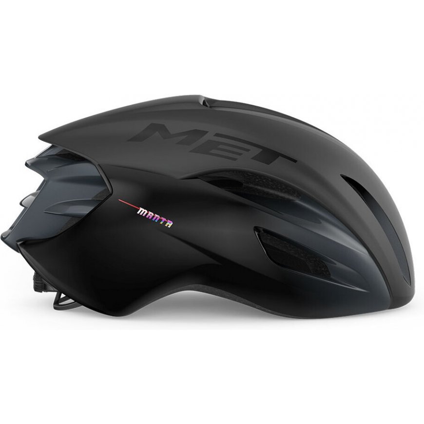 MET Manta is a road helmet equipped with a spectacular and researched aerodynamic design. MIPS technology provides additional safety and carefully designed air conditioning keeps your head cool. The vertically adjustable Safe-T Orbital adjustment strap goes around the entire head to avoid pressure points and ensure the best fit. The Fidlock magnetic buckle is easy to use and the skin of the neck cannot get caught between the buckle. The helmet comes with a fabric bag that facilitates storage and transport.