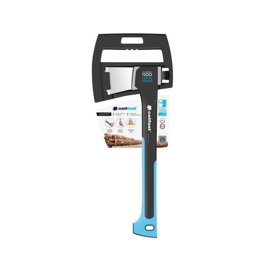 Universal ax, U1100 1.1 kg 450 mm (41-002) Description: a strong chopping ax recommended for artists, gardens, construction and maintenance, blades made of high-quality inductively hardened steel, extremely durable, closely connected to the plinth, a profiled plinth made of made of fiberglass-reinforced composite, must ensure cushioning during impact. soft, anti-slip SAFETOUCH ™ surface covering the long length of the plinth ensures reliable holding and ease of use ideal balance of the tool ensures ergonomics and high working comfort multifunctional cover ensures safe transfer of ax and blades, holding length 450 mm , weight 1.1 kg