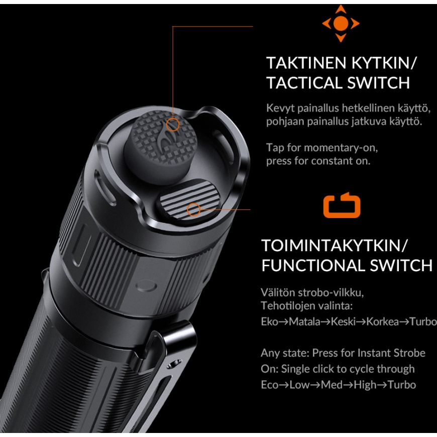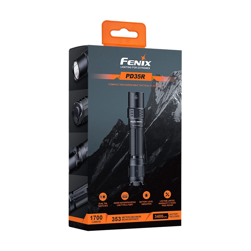 The Fenix PD35R flashlight is a compact and powerful rechargeable flashlight that replaces the popular UC35 V2.0 model. Dazzling max. 1700 lumen brightness and far max. The visible beam of 353 meters puts the PD35R in the elite class of compact flashlights. Using the PD35R is really fast and simple from the two push button switches on its end. The large push button is used to turn on the light and the smaller button is used to switch between different brightness modes. The PD35R is charged with a USB C charging connector according to the EU charging standard. The Fenix PD35R is designed for the demanding hobbyist, authorities and for batch and camping use, when you require a very compact, durable and reliable flashlight without compromising on performance.