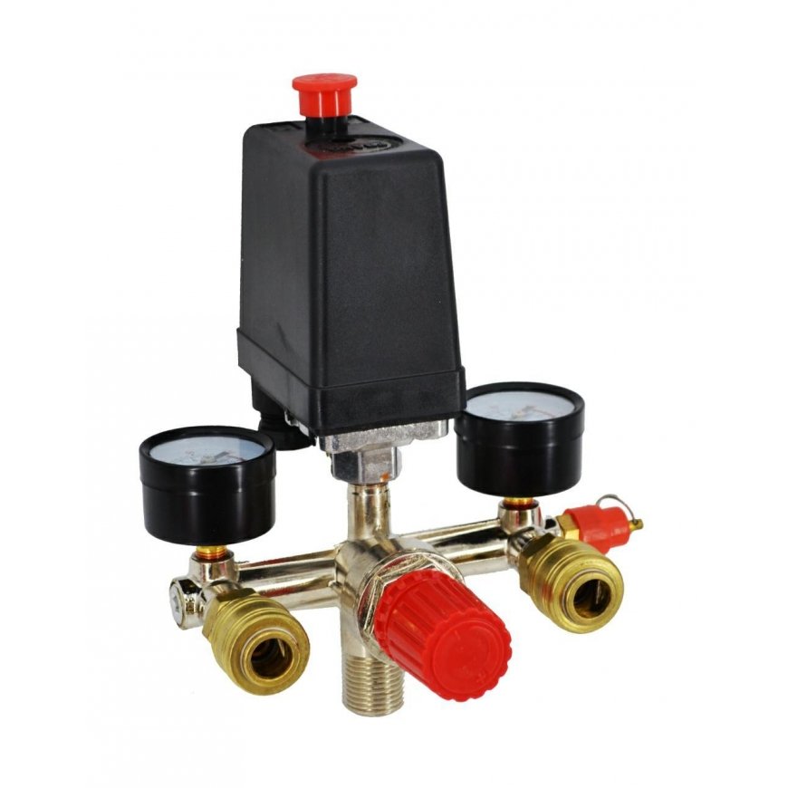 Pressure switch (pressure switch) with manifold, quick connectors and two manometers. Intended for 24L and 50L capacity compressors. The reducer has a valve that facilitates starting the compressor - it releases the pressure from the manifold. Easy-to-read pressure gauges in a glass cover. Compressor pressure reducer made of high-quality materials, with particular emphasis on strength standards. Technical data: Power supply: 230V/50Hz Maximum current: 20A Maximum pressure: 12 Bar (1.25 Mpa, 175 Psi) Working pressure: 6-8 bars Adjustable: 3-12 bar Connection diameter: 3/4" Weight: 0.770 kg