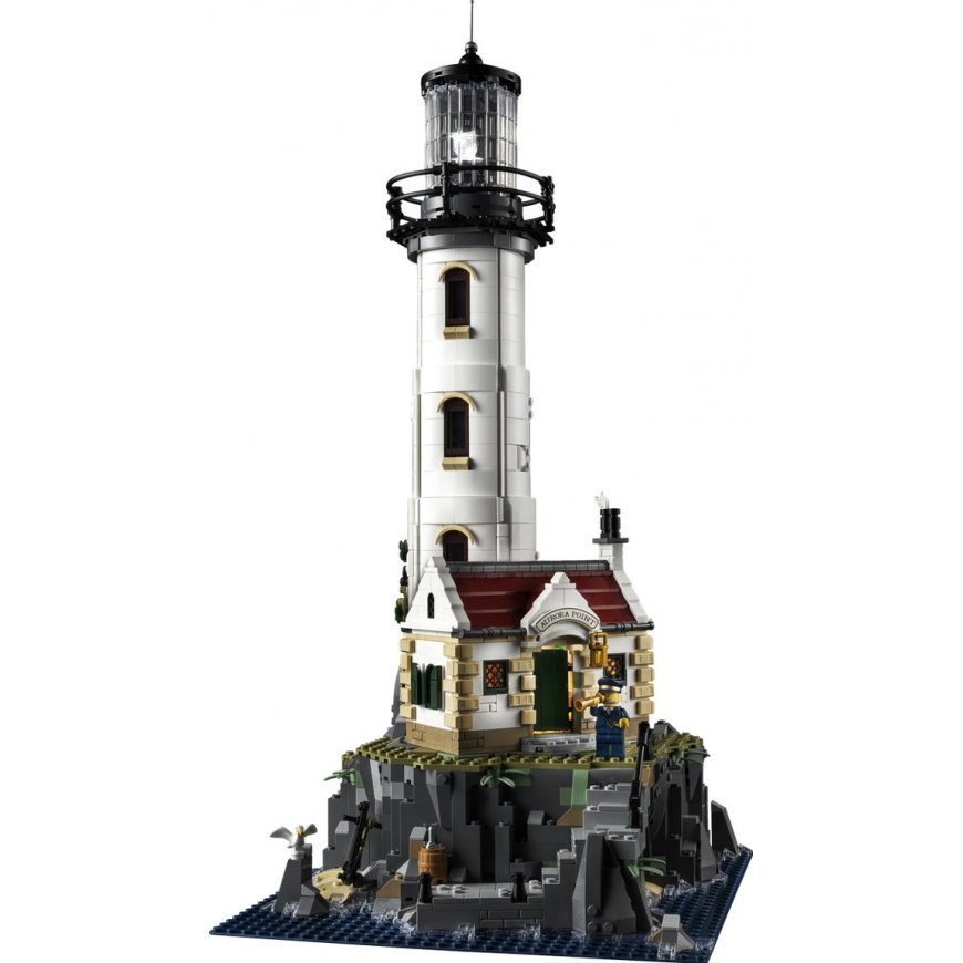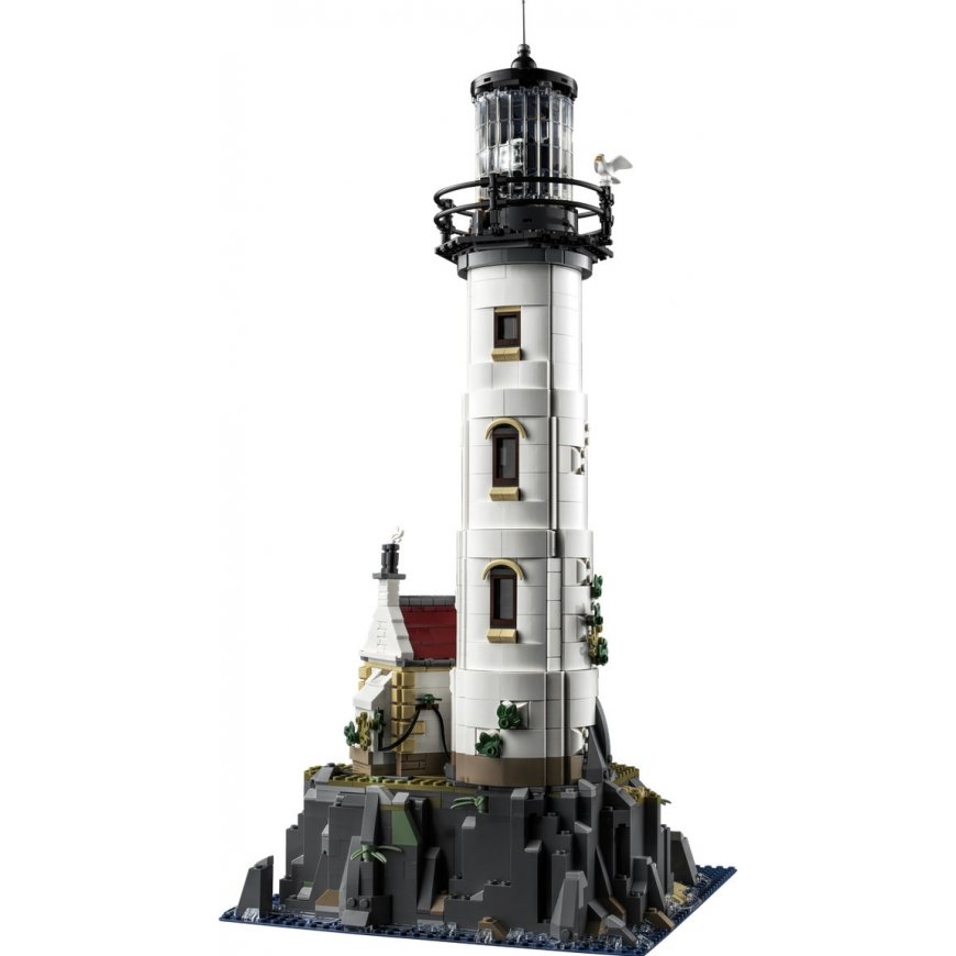 Let your imagination run wild with the building project of the LEGO® Ideas Motorized Lighthouse (21335) set. There is a lighthouse tower, a motorized rotating light and specially designed Fresnel lenses, and a cabin with an inviting fireplace. The cabin and the tower open to reveal the many details of the interior. A buildable rowing boat is also included. The buildings are located on a rock built of blocks, from where stairs lead down to the pier and the cave to the pirates' treasure. Lighthouse keeper and sailor minifigures, a seagull and a cat are adventuring in the landscape.