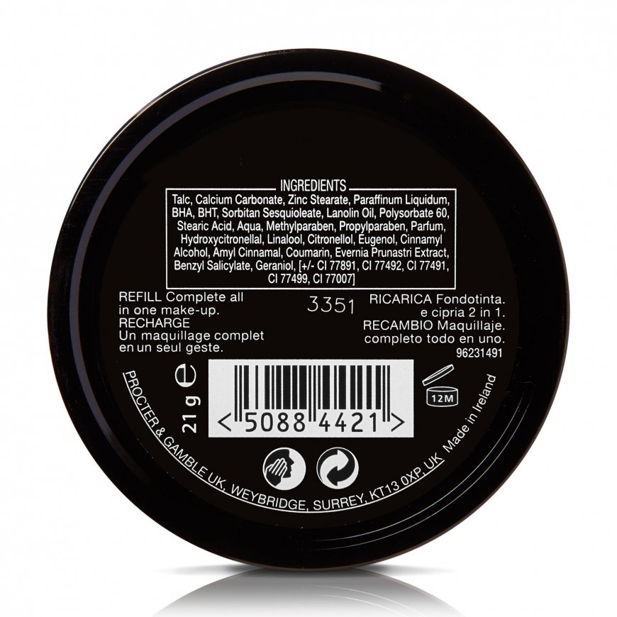| Состав | Talc, Calcium Carbonate, Zinc Stearate, Paraffinum Liquidum, BHA, BHT, Sorbitan Sesquioleate, Lanolin Oil, Polysorbate 60, Stearic Acid, Aqua, Methylparaben, Propylparaben, Parfum, Hydroxycitronellal, Linalool, Citronellol, Eugenol, Cinnamyl Alcohol, Amyl Cinnamal, Coumarin, Evernia Prunastri Extract, Benzyl Salicylate, Geranoil, [+/- CI 77891, CI 77492, CI 77491, CI 77499, CI 77007] |
